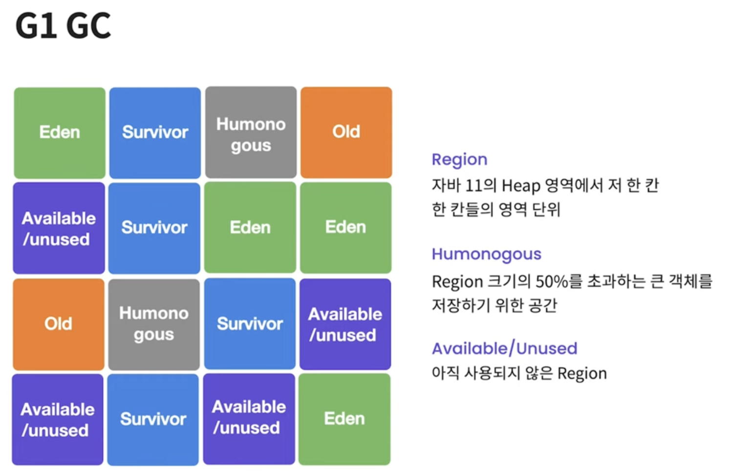- 기존의 GC 알고리즘에서는 Heap 영역을 물리적으로 고정된 Young / Old 영역으로 나누어 사용하였지만, G1 gc는 아예 이러한 개념을 뒤엎는 Region이라는 개념을 새로 도입하여 사용.