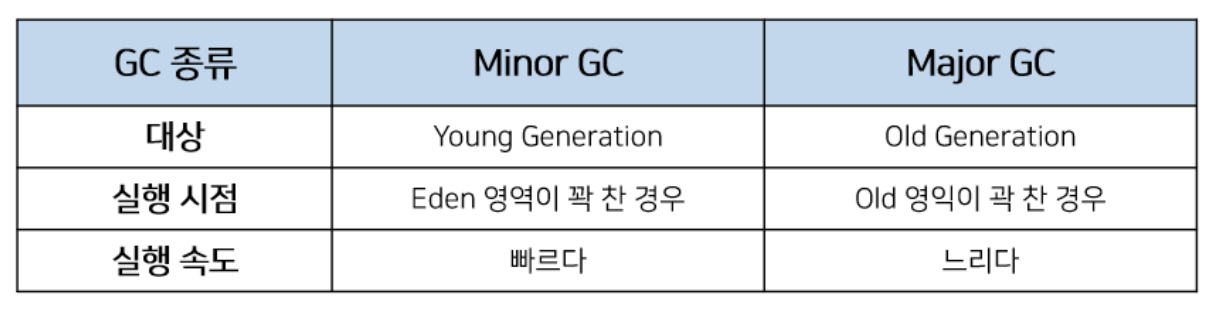 - 이곳에서의 gc를 메이저gc 혹은 full gc라고함