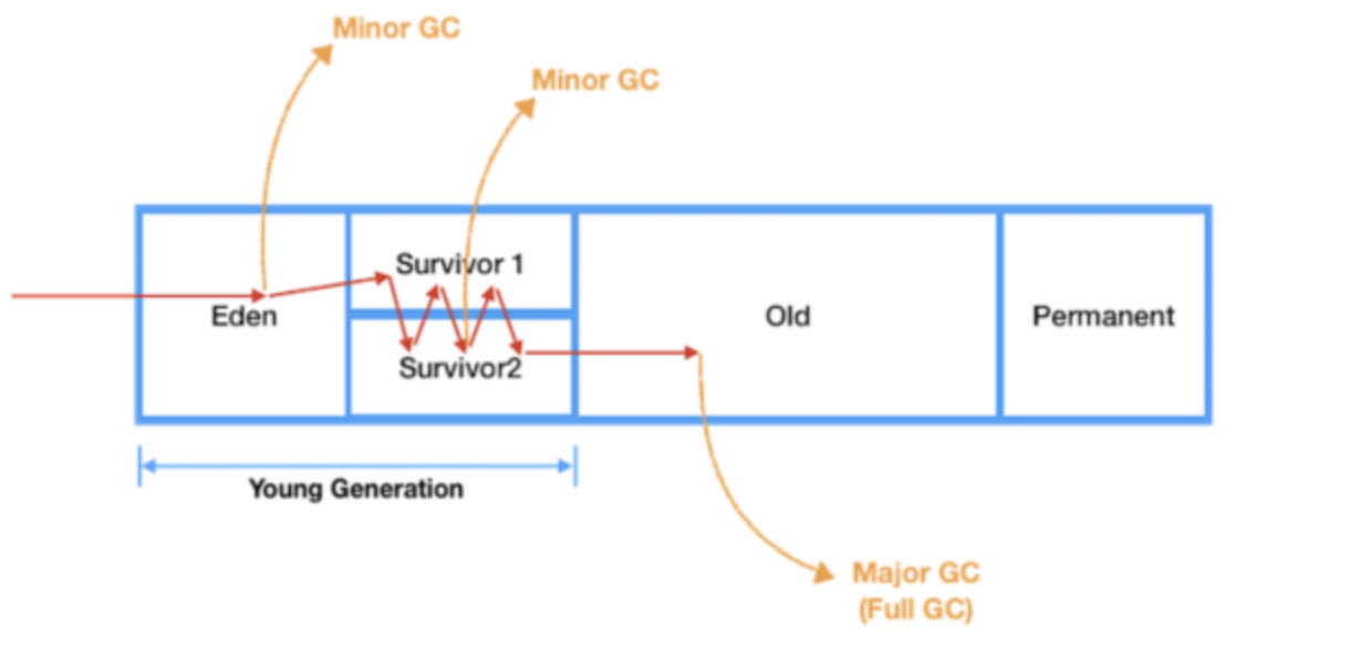- heap 영역을 나누는 이유는 heap 전체를 탐색하여 메모리를 해제하는 full gc로 인한 성능상의 이슈를 최소화 시키기 위함