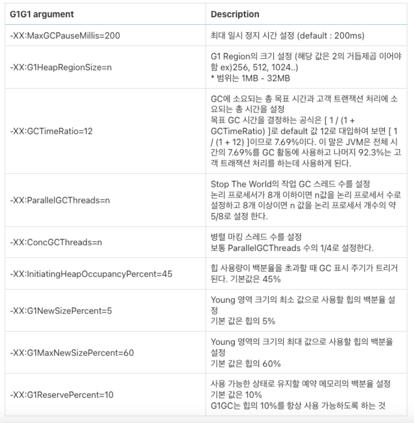 - 기본적으로 G1GC의 경우 다른 GC 알고리즘(Serial, Parallel, CMS)에서 사용하던 JVM 인수와 같이 사용할 경우 G1GC의 파라미터가 정상적으로 동작하지 않을 수 있다.