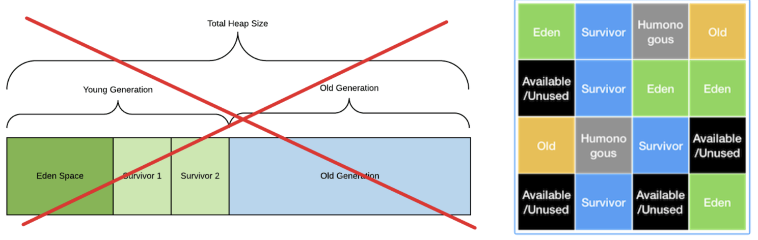 - 전체 Heap 영역을 Region이라는 영역으로 체스같이 분할하여 상황에 따라 Eden, Survivor, Old 등 역할을 고정이 아닌 동적으로 부여