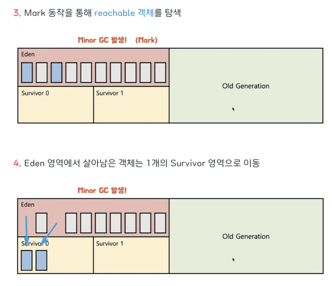 - young 영역과 old 영역의 세부적인 동작방식은 다르나 다음 두가지는 공통이다