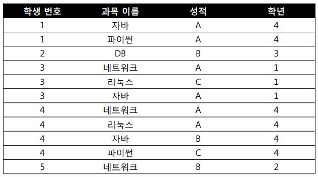 - 삭제 이상 : 학생 번호가 2번인 학생의 과목에 대한 성적을 삭제할 경우 학생 번호와 학년 등 모든 정보가 같이 삭제되어 학생의 정보 자체가 사라짐