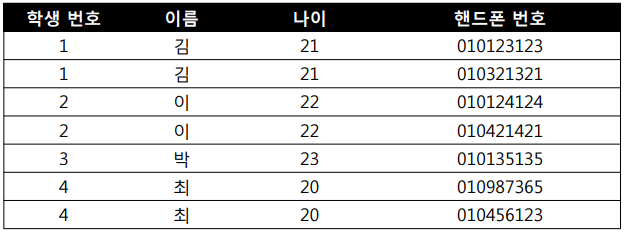 - 갱신 이상 : 학생 번호가 3번인 학생이 2학년이 되어 학년 정보를 변경 하려 하는데 3개를 모두 하나씩 바꿔줘야 함, 하나라도 안바꿀 경우 한명의 학생에 대한 정보가 서로 달라지는 정보의 모순성이 발생