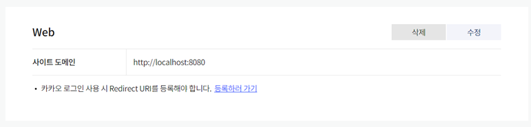 등록하러 가기를 눌러서 카카오 로그인이 성공하면 redirect 될 url을 설정해준다.