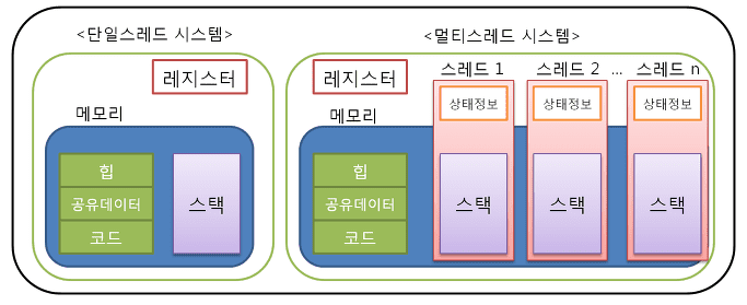 하나의 프로세스 내부에서 독립적으로 실행되는 하나의 작업 단위, 세부적으로는 운영체제에 의해 관리되는 하나의 작업 혹은 테스크를 의미.