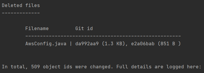 이 결과 AwsConfig.java 파일에 관련된 히스토리는 삭제된다.