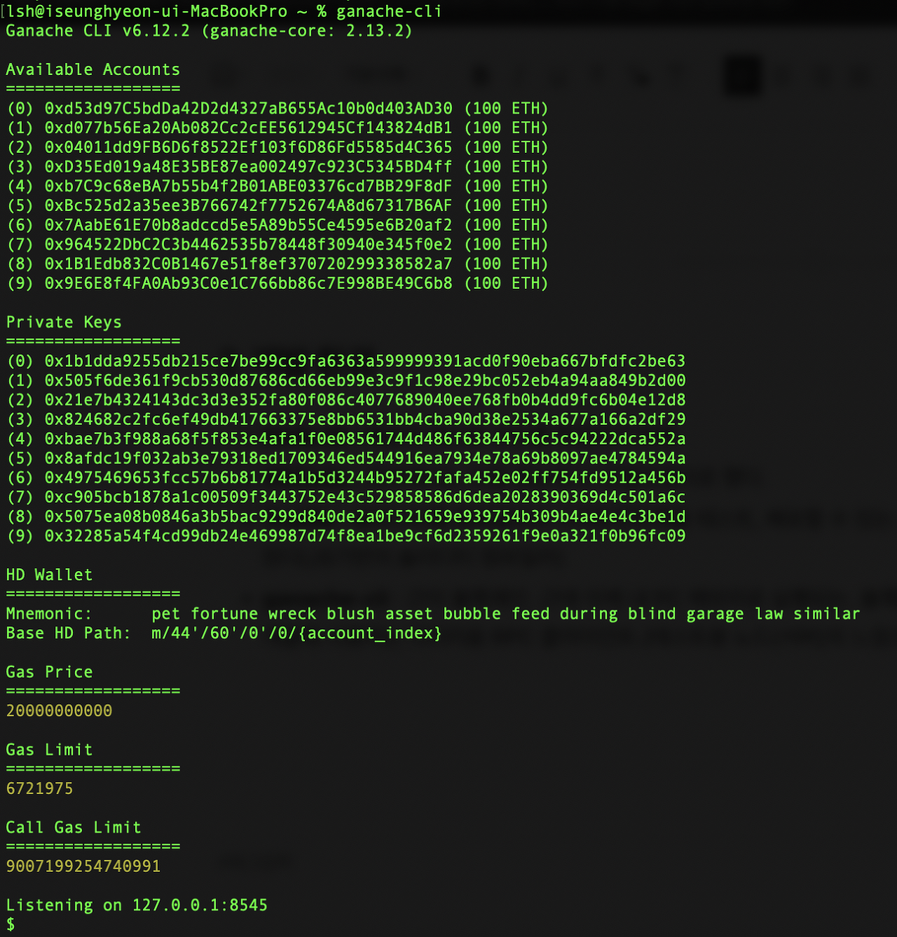 두번째 인자로는 콜백함수가 들어간다. 이 콜백함수의 파라미터로 ganache-cli에서 생성되는 10개의 account가 들어간다.
