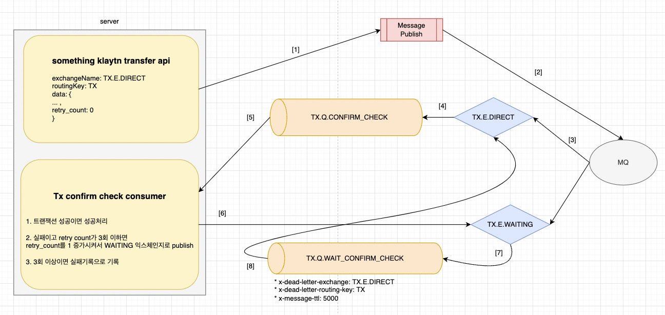 - 트랜잭션이 성공이면 데이터베이스에도 관련 정보를 반영 후 ack으로 마무리하고, 실패면 retry_count를 1추가해서 DLX로 보낸다. 이곳에서 5000ms동안 대기하고 다시 작업큐로 메시지를 보내서 반복한다.(넉넉히 5초로 딜레이를 주었다)