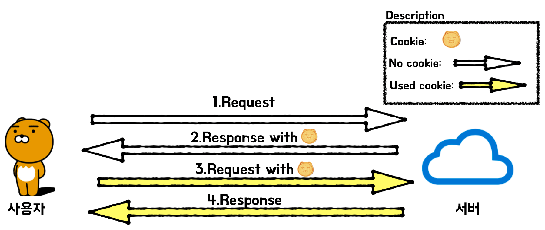 - 이후 클라이언트의 요청에는 2번에서 응답받은 세션아이디를 쿠키에 담아서 함께 요청한다.